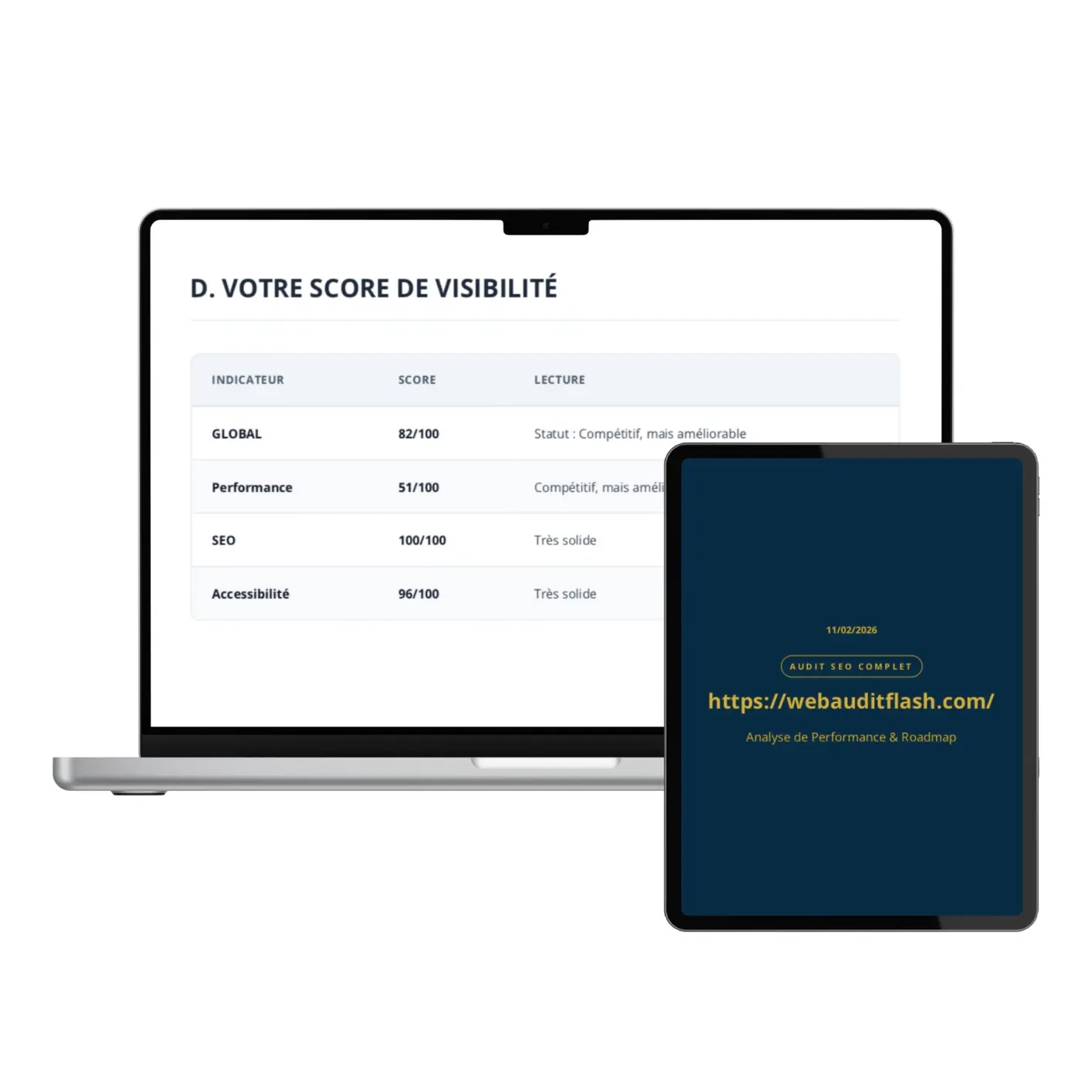 Code + Visuel : La plupart des audits ne lisent que le code. Le nôtre « regarde » aussi votre site comme un visiteur humain — pour détecter les erreurs de design qui font fuir vos clients avant même qu’ils lisent votre offre.